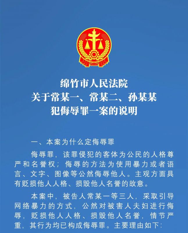 绵竹市人民法院关于常某一、常某二、孙某某犯侮辱罪一案的说明