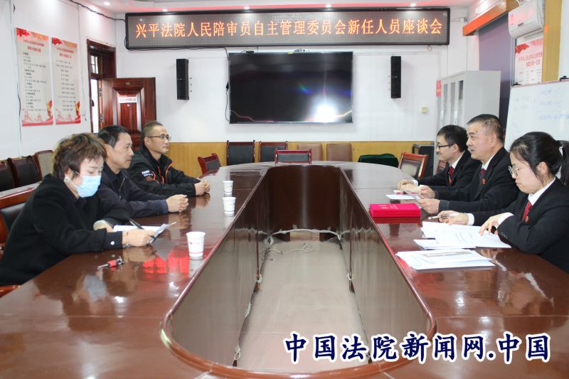 法院讯(李军委)为贯彻落实《人民陪审员法》,切实发挥人民陪审员在审判工作中的作用,11月10日下午,兴平法院召开人民陪审员自主管理委员会新任人员座谈会,宣布人民陪审员自主管理委员会挂牌成立。会议由党组成员、政治部主任梁文强主持,人民陪审员自主管理委员会主任解晓娟、副主任刘原方及秘书长张选党参加了会议。