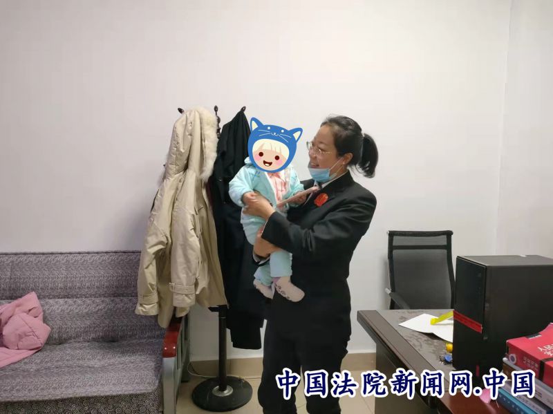 据了解,除了董某本人之外并无亲友前来旁听案件审理。一边是严肃的法庭纪律和审判秩序,一边是幼小孩子的哭闹,小朋友由谁来照看?眼前的一幕让法官也犯了难,权衡之下,经过被告董某的同意,承办法官让民庭书记员郭苗苗在庭审期间帮忙照顾孩子。可能是女性身上特有的柔软拉近了与孩子的距离,小孩并未抗拒她,郭苗苗抱着孩子在办公室来回走动,给她玩玩具、讲故事等等,使出浑身解数哄乐逗趣,让原本啼哭的孩子渐渐安静下来。熟悉之后,小朋友在这位刚认识的阿姨怀里,望着审判庭外的宣传海报咿咿呀呀,孩子天真烂漫的举动,在此时此刻却显得如此特别。郭苗苗抱着他,在办公室的走廊上,一幅一幅,认真细致地给他讲着海报上的内容。当天的庭审持续了三个小时,整个过程中,孩子一直很乖巧,没有哭闹。