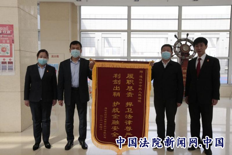 4月22日,通化某商业银行股份有限公司行长一行专程到通化中院,为承办法官及执行团队送上“尽职尽责捍卫法律尊严 利剑出鞘护航金融安全”的感谢锦旗。